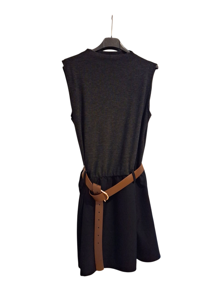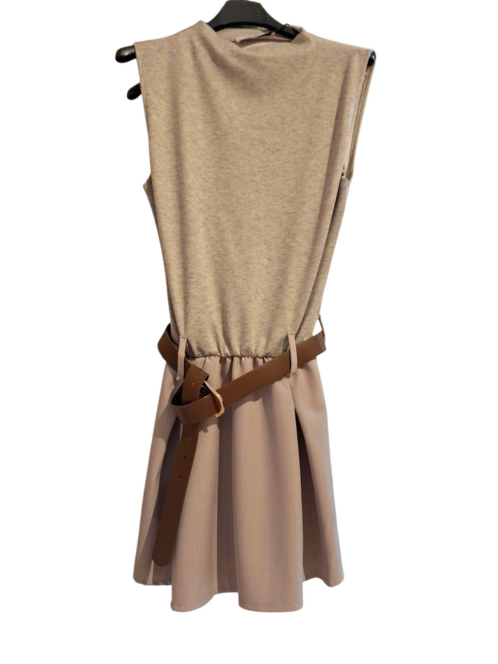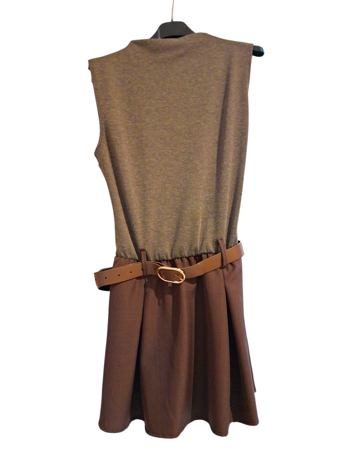 Questo elegante abito smanicato è completo di una cintura che sagomata la tua figura conferendoti un'aria chic e sofisticata. Realizzato con tessuti di alta qualità, è confortevole da indossare tutto il giorno. Perfetto per le occasioni speciali o per un look casual ma raffinato.
