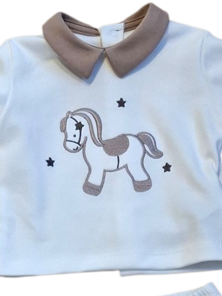 Questo completo 2 pezzi per maschietto è perfetto per i giorni più freddi grazie al caldo cotone. Il colletto aggiunge un tocco di eleganza mentre il dolce ricamo di cavalluccio lo rende divertente per il tuo piccolo. Comodo, funzionale e adorabile, il completo è una scelta sicura per il tuo bambino.