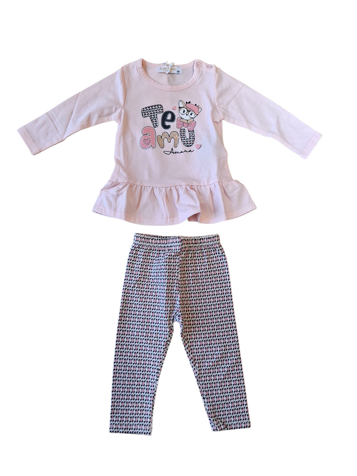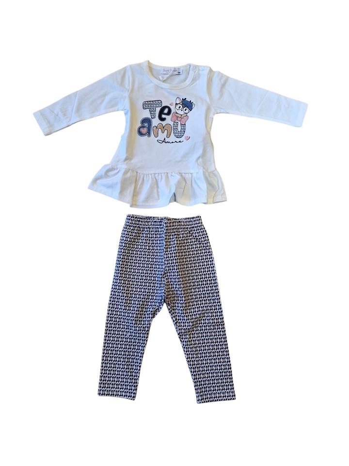 Questo completo 2 pezzi è perfetto per le femminucce! La maxi t-shirt con balza sul fondo e stampa centrale offre un look moderno e accattivante, mentre i leggings a fantasia garantiscono il massimo del comfort e stile. Ideale per le più piccole fashioniste in erba.