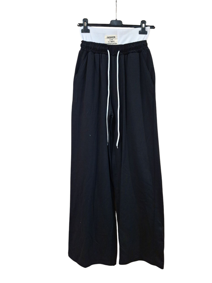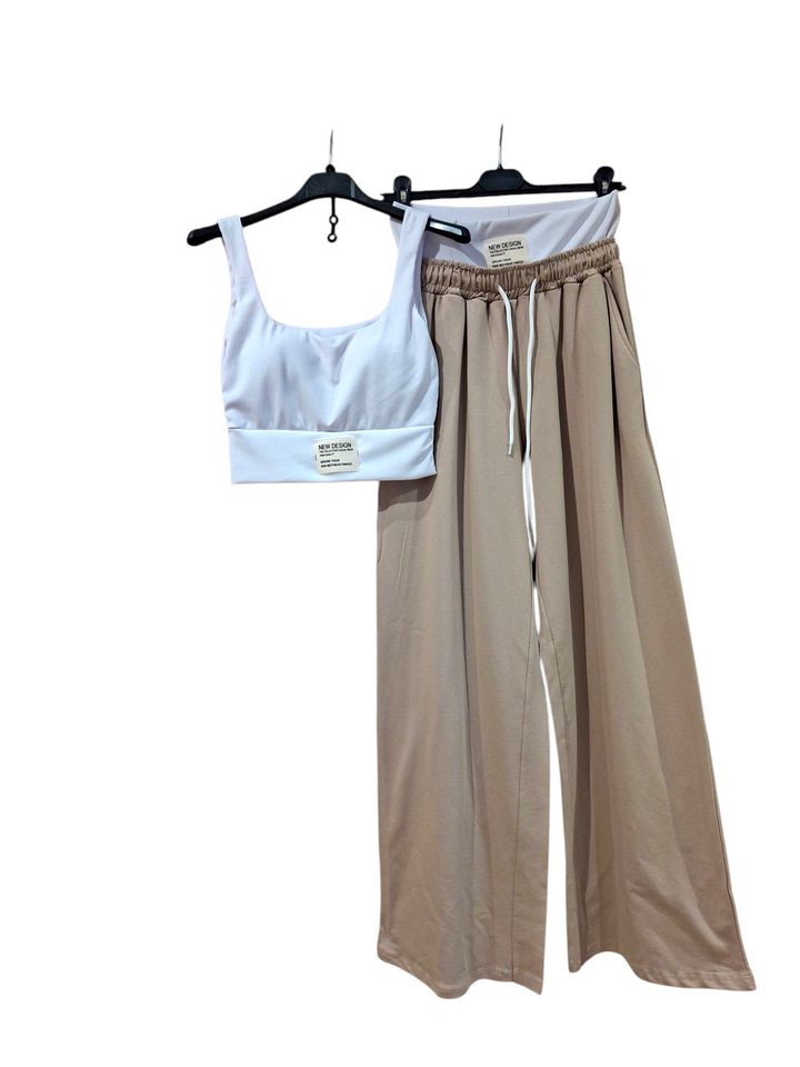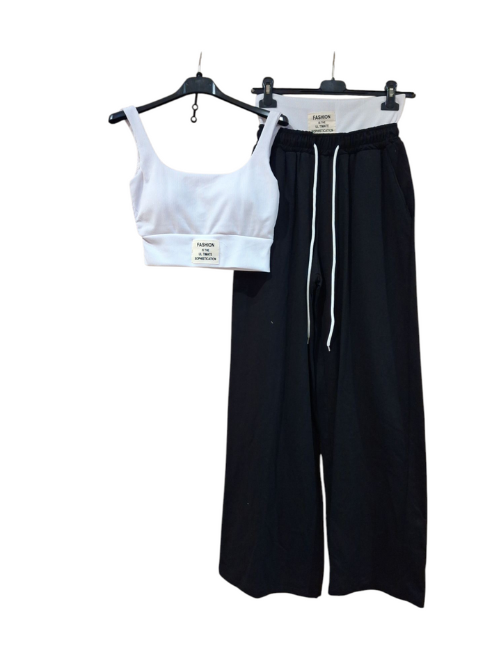 Completo casual 2 pezzi con top imbottito e pantalone palazzo. Ottimo per un look comodo e alla moda. Il top imbottito offre un supporto extra e il pantalone palazzo garantisce una vestibilità ampia e confortevole. Ideale per un outfit da giorno o per lo sport.