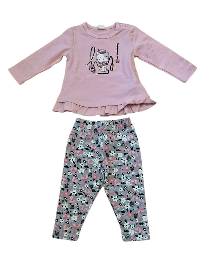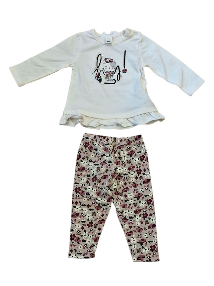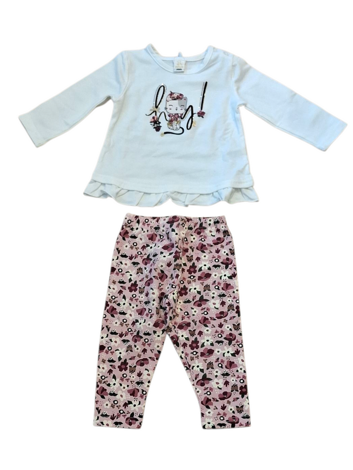 "Completo 2 pezzi per bambine in caldo cotone. T-shirt girocollo a manica lunga con stampa di un grazioso gattino al centro, bottoncini sulla spalla e rouche sul fondo. Fantastici leggings a fantasia floreale per un look unico e comodo."