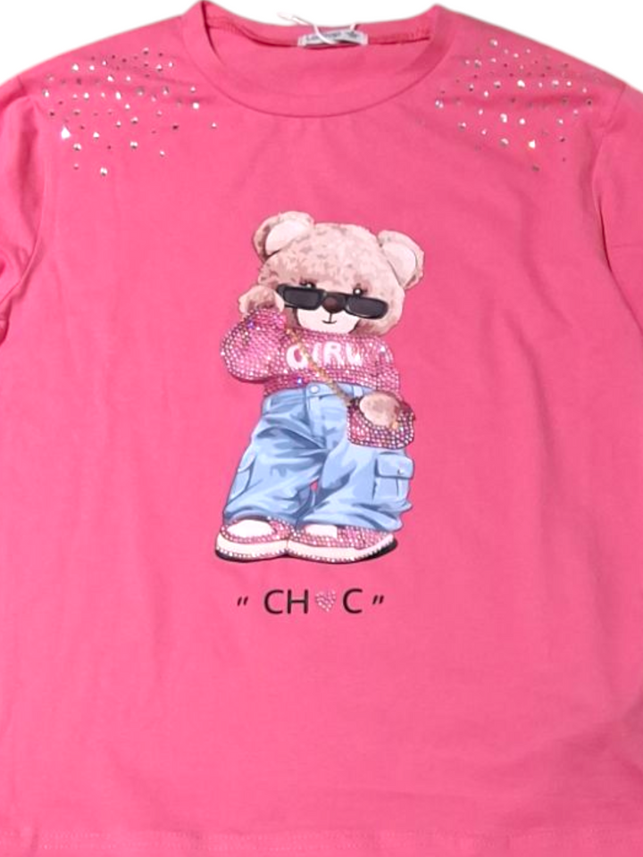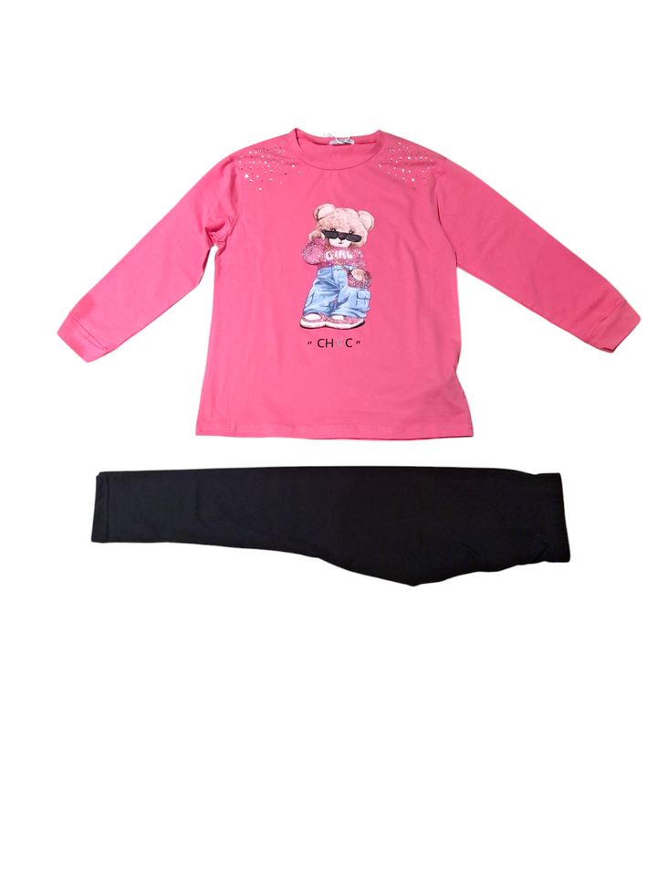 Questo completo 2 pezzi per femmina è perfetto per essere alla moda e comoda allo stesso tempo. La maxi T-shirt girocollo manica lunga presenta una stampa orso che aggiunge uno stile unico, mentre i brillantini sulle spalle danno un tocco di eleganza. I leggings lunghi tinta unita completano il look e offrono la massima comodità.