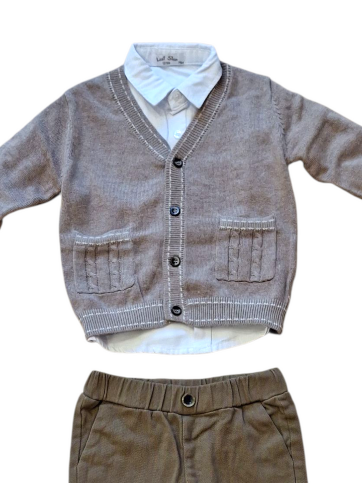 Questo completo 3 pezzi è perfetto per i tuoi maschietti! Include un cardigan con taschini, una camicia e un pantalone con elastico in vita, garantendo comfort e stile per il tuo bambino. Pratico e alla moda, ideale per ogni occasione.