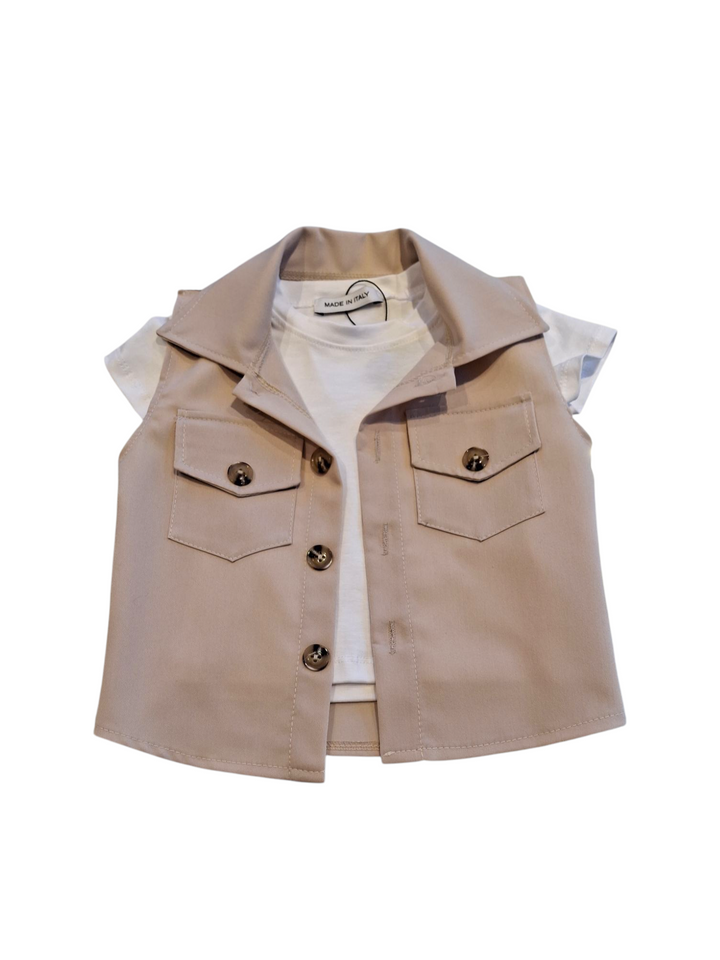 Il nostro Completo 3 pezzi è composto da una t-shirt, un gilet con bottoni e dei bermuda con coulisse. Realizzato con tessuti di alta qualità, ti accompagnerà con stile e comfort in ogni occasione. Il gilet a camicia ti darà un tocco formale, mentre i bermuda ti garantiranno libertà di movimento. Un perfetto mix di eleganza e praticità.