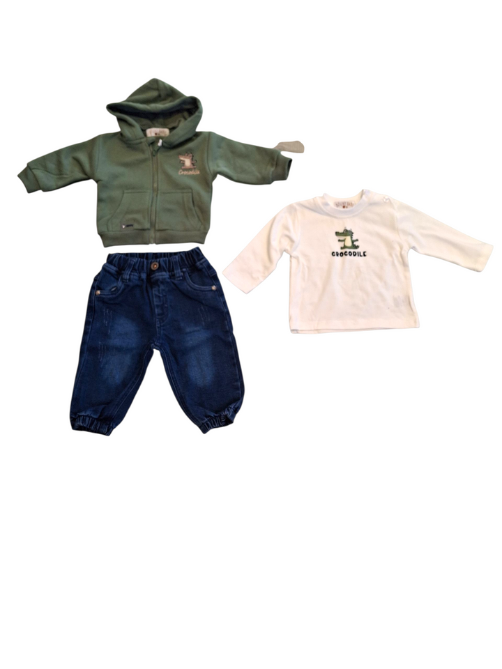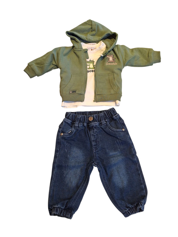 Rendi il tuo maschietto felice con questo completo 3 pezzi! Include una felpa con cappuccio comoda, una t-shirt manica lunga con stampa coccodrillo divertente e jeans con elastico in vita per il massimo comfort. Un'ottima scelta per un look alla moda e pratico.