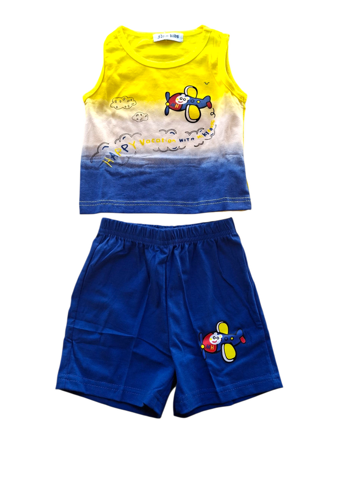 Questo completo a canotta per maschietto con stampa aereoplanino è ideale per l'estate. Con un design divertente e leggero, il tuo bambino sarà sempre fresco e alla moda. Perfetto per le giornate estive all'aria aperta, questo completo offre il massimo comfort e stile per il tuo piccolo.