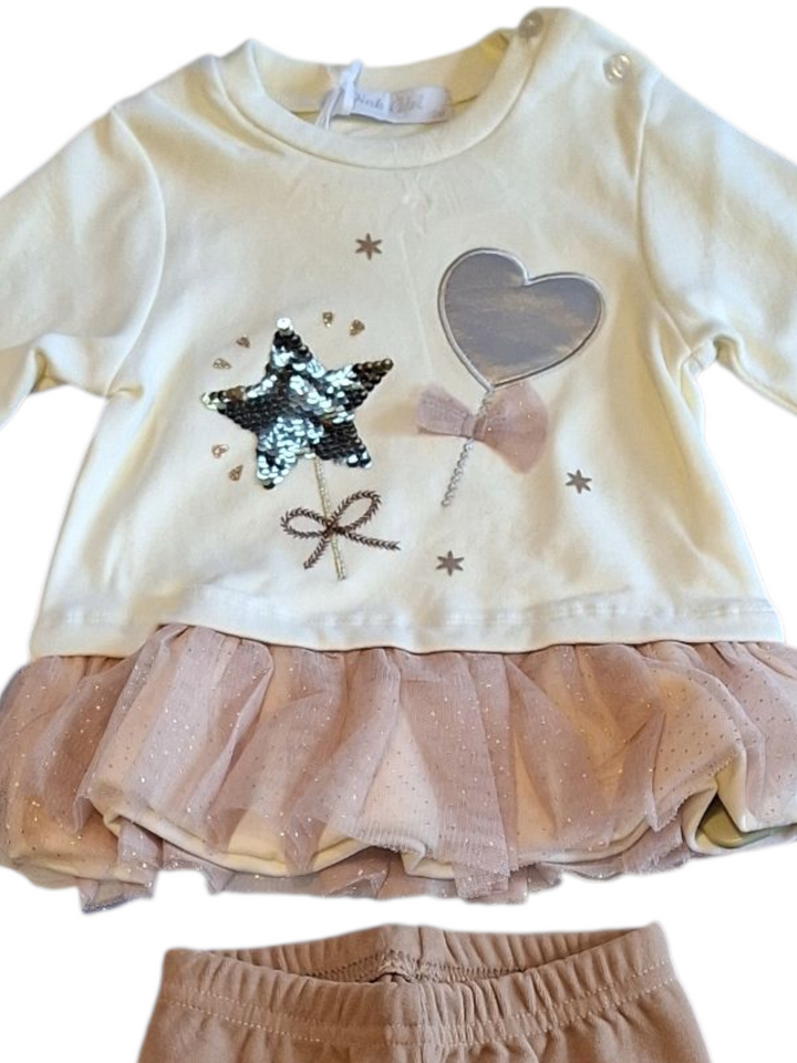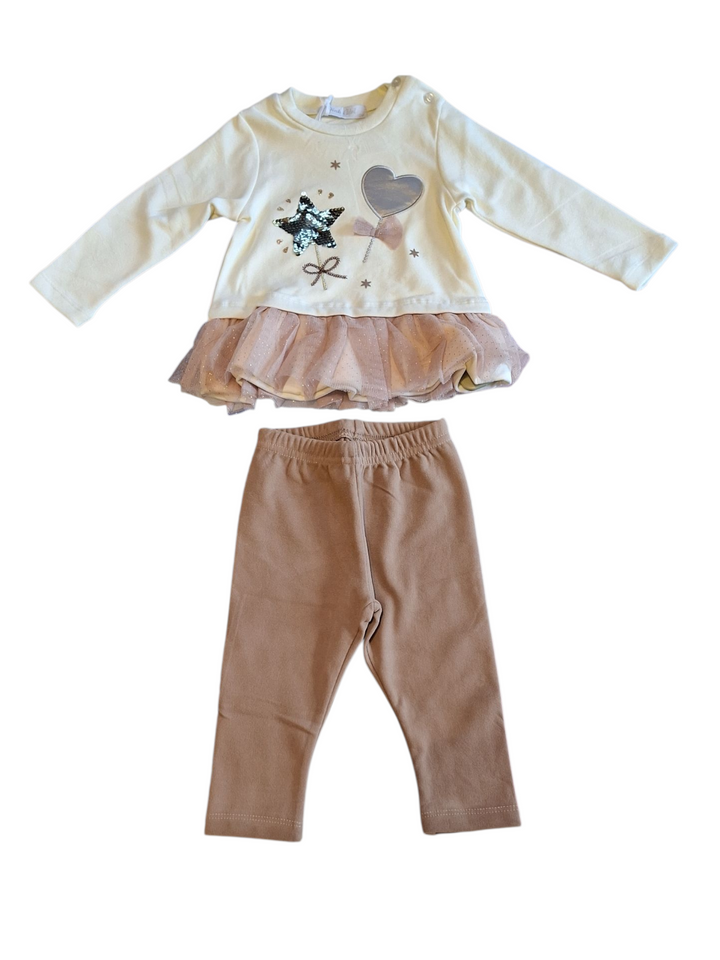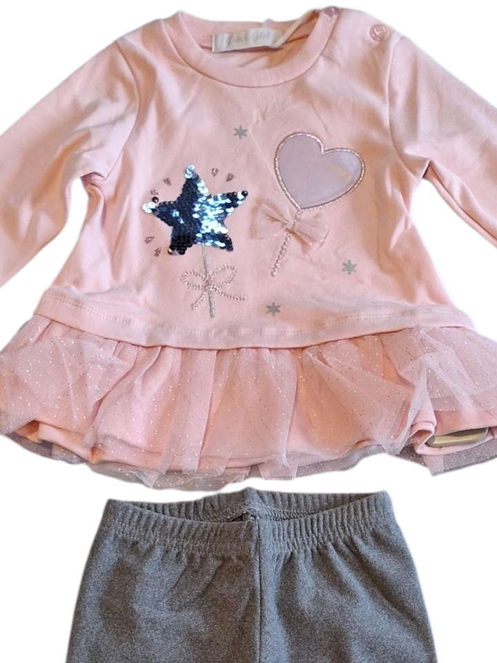 Questo completo per femminuccia è l'ideale per un look comodo e alla moda. La maxi t-shirt con inserto in tulle sul fondo e i leggings tinta unita garantiscono praticità e stile per la tua bambina. Perfetto per ogni occasione, regala alla tua piccola un outfit trendy e confortevole.