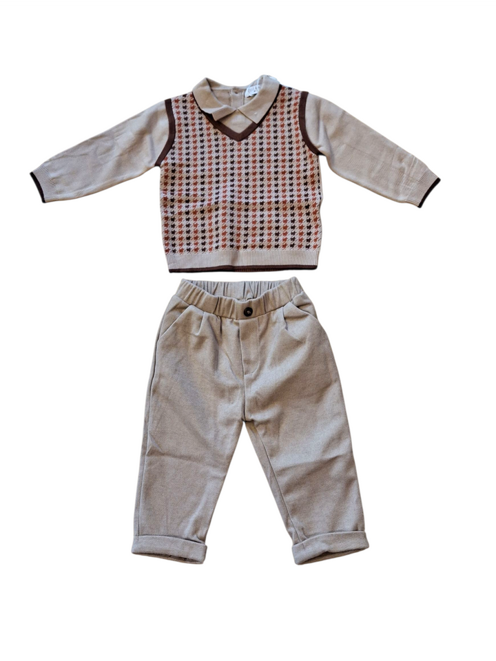 Questo completo per maschietto è perfetto per le occasioni speciali! Il maglioncino con colletto e finto gilet gli dona un look elegante e raffinato, mentre il pantalone in panno garantisce comodità e calore. Ideale per far sentire il tuo bambino come un vero signore!