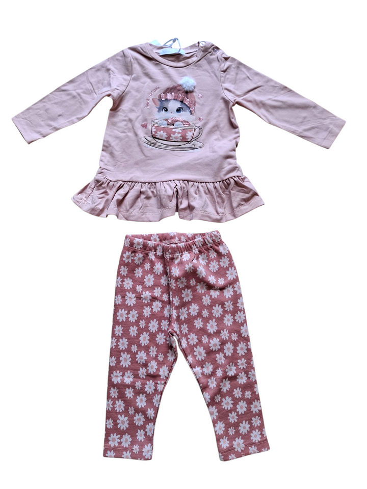 Questo completo 2 pezzi per femminuccia è perfetto per le piccole fashioniste! La maxi t-shirt presenta una romantica rouche sul fondo e una stampa adorabile di un dolce gattino. I leggings a fantasia fiori aggiungono un tocco di allegria e comodità. Composizione in cotone per un look accattivante e confortevole.