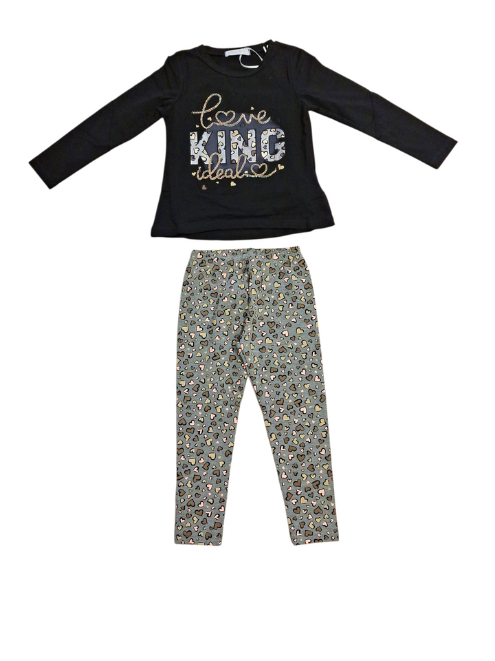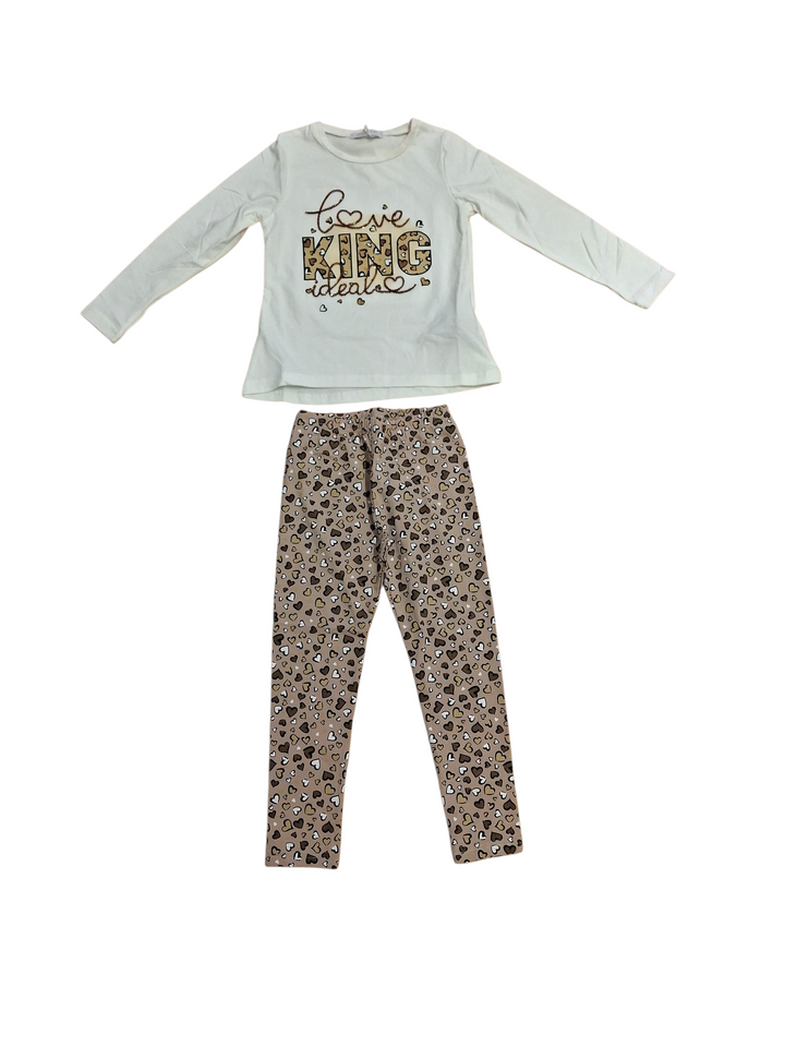 Questo completo di T-shirt a manica lunga e leggings è perfetto per le femminucce alla moda. La T-shirt ha una stampa divertente e centrale, mentre i leggings sono decorati con fantasie colorate. Il completo è comodo e stiloso, ideale per un look divertente e trendy per la tua bambina.