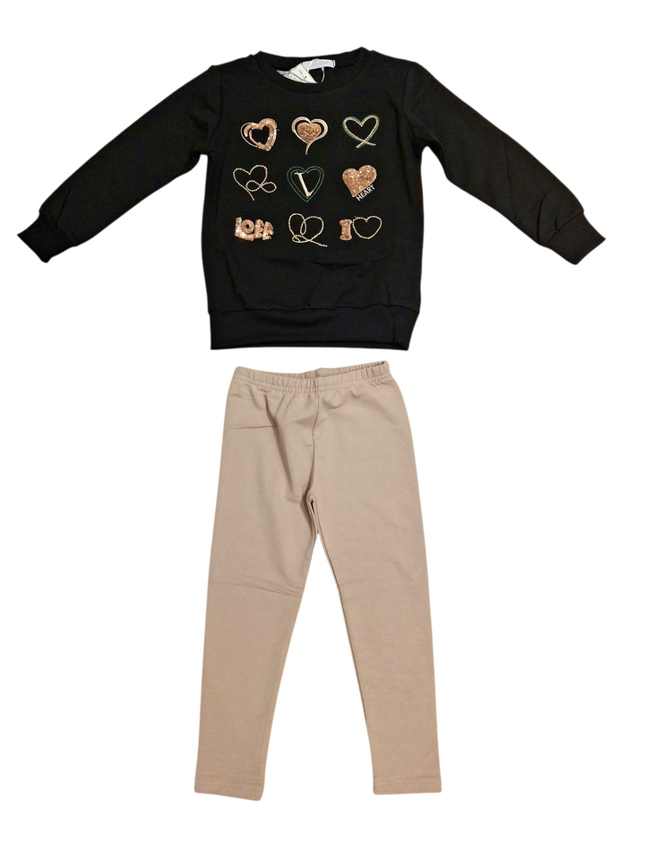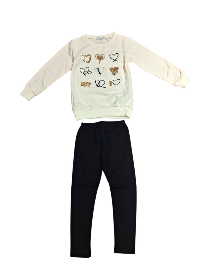 Questo completo 2 pezzi per femminuccia è composto da una maxi felpa impreziosita con cuoricini e dei leggings tinta unita. Realizzato con materiali di alta qualità per garantire comfort e stile alle piccole fashioniste. L'abbigliamento perfetto per un look trendy e alla moda.