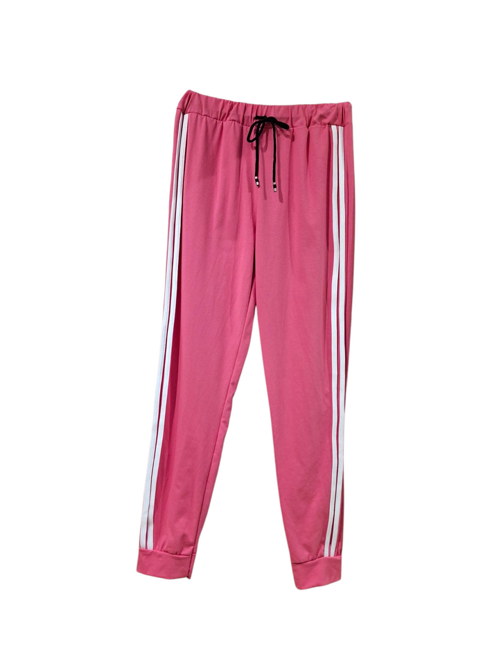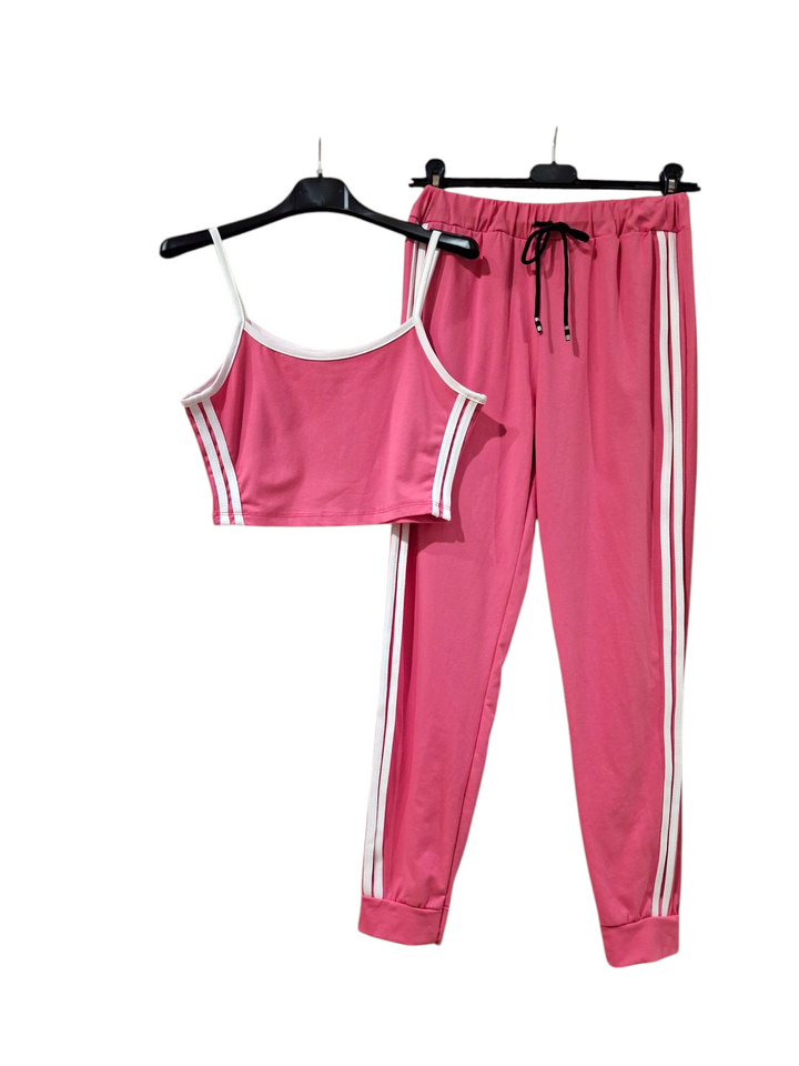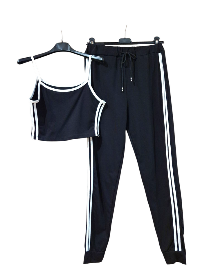 Questo completo sportivo 2 pezzi è perfetto per chi vuole un look sportivo ma alla moda! Il top a bratelline garantisce massima libertà di movimento, mentre il pantalone con polsini e bande laterali offre un fit comodo e aderente senza limitare i movimenti. Perfetto per tenersi in forma e sentire il massimo comfort durante l'attività fisica!