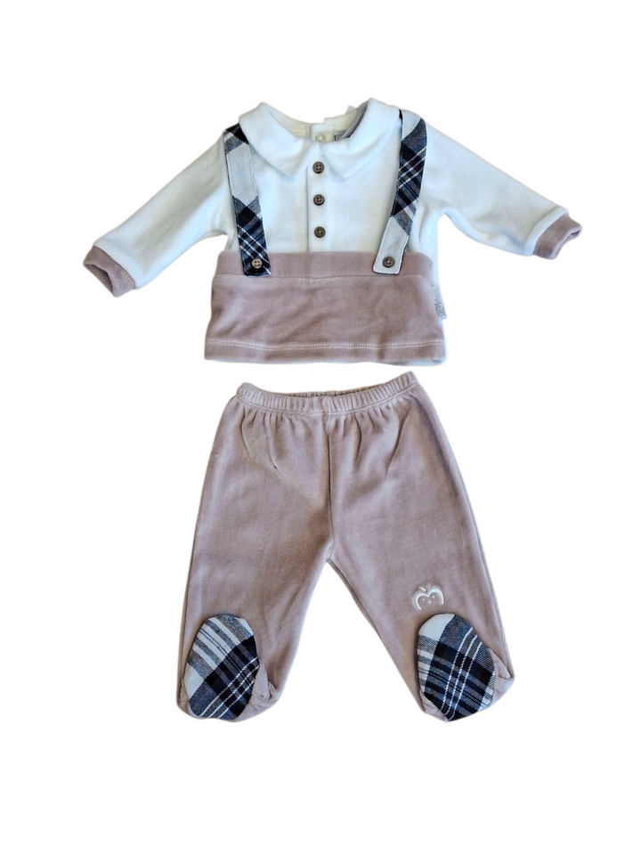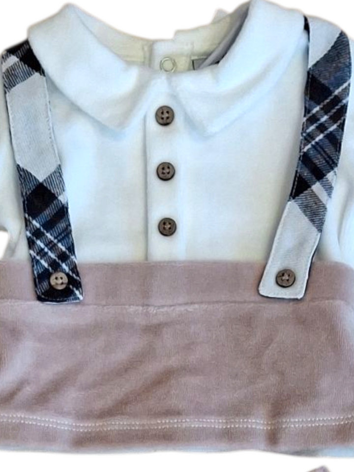Questo completo da due pezzi è perfetto per il tuo maschietto! La maglietta ha un elegante colletto, finti bottoni e graziose finte bratelle, mentre i pantaloncini con piedini danno un tocco adorabile. I bottoni a clip sul retro garantiscono una vestibilità comoda e sicura. Aggiungi stile e comfort all'abbigliamento del tuo bambino!