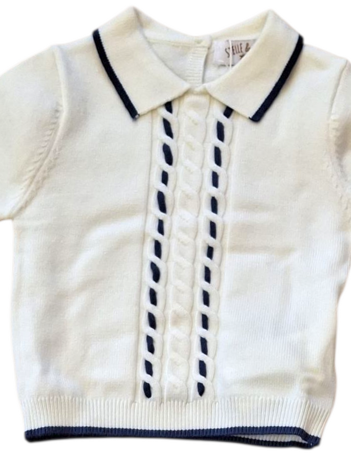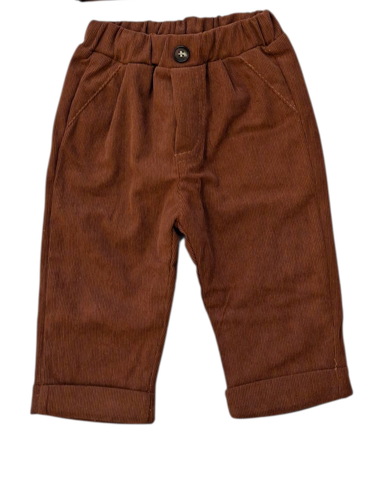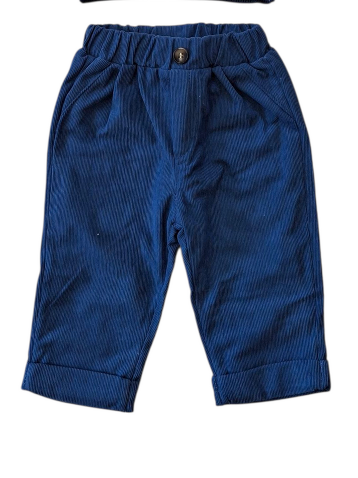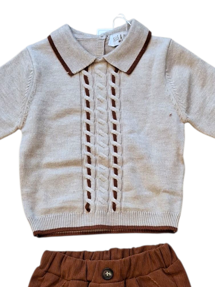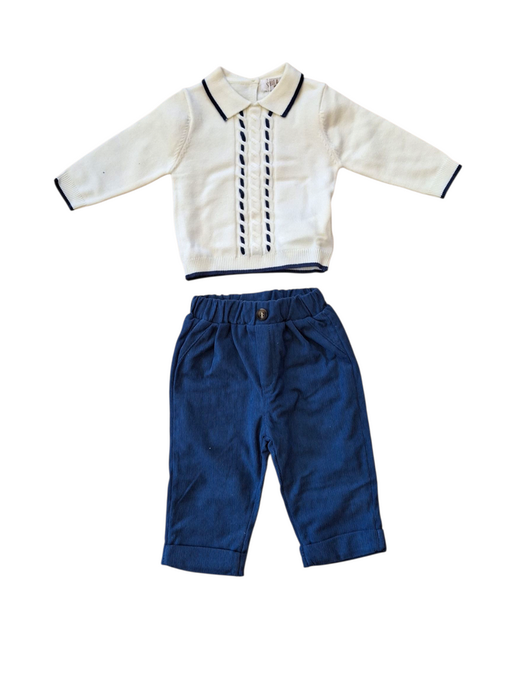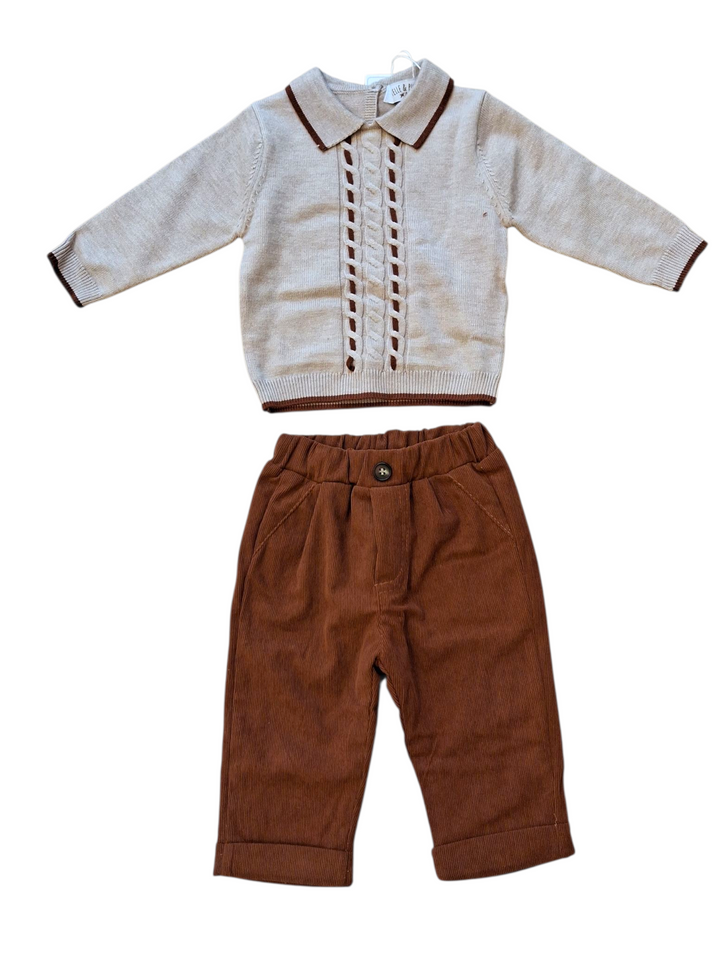 Questo completo per maschietto è composto da una maglia con colletto e motivo a treccia centrale e un pantalone in velluto a costine. Perfetto per un look elegante e comfortevole per il tuo bambino. Realizzato con materiali di alta qualità per garantire resistenza e stile.