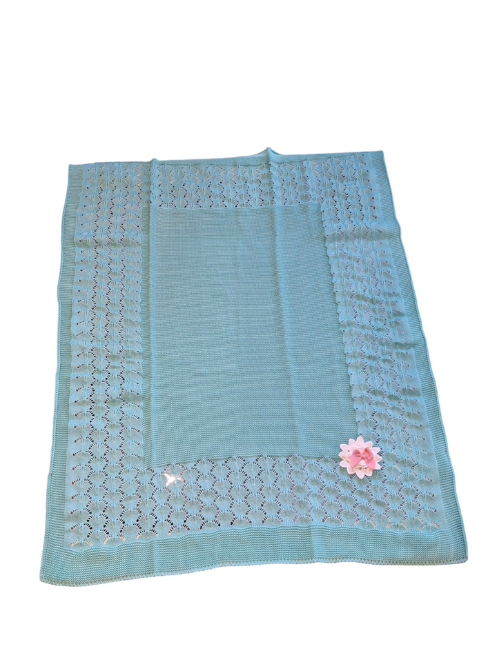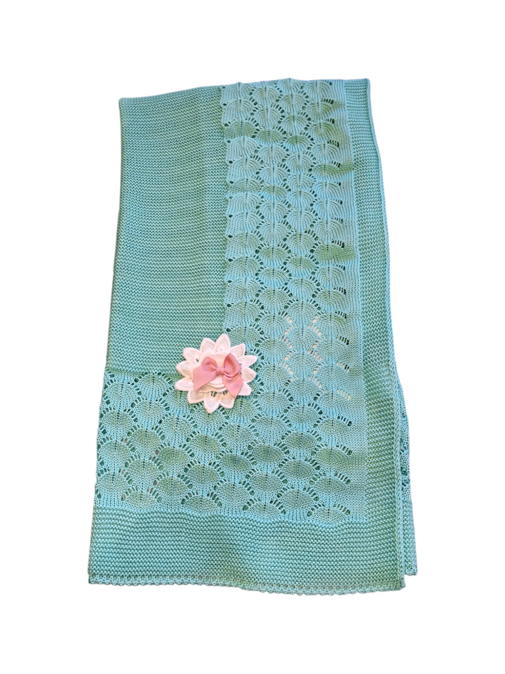 La nostra coperta verde acqua è realizzata in pregiato filo di scozia, arricchita da un elegante ricamo floreale e una delicata applicazione a fiore. Avvolgiti in morbidezza e stile con questo prodotto di qualità, perfetto per coccolare la tua piccola nelle fresche serate d'estate.