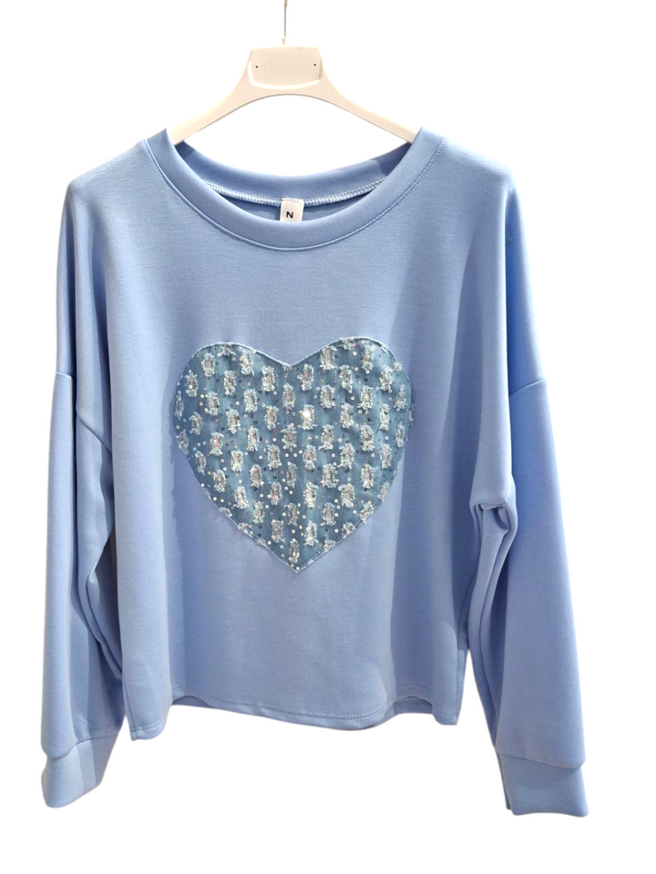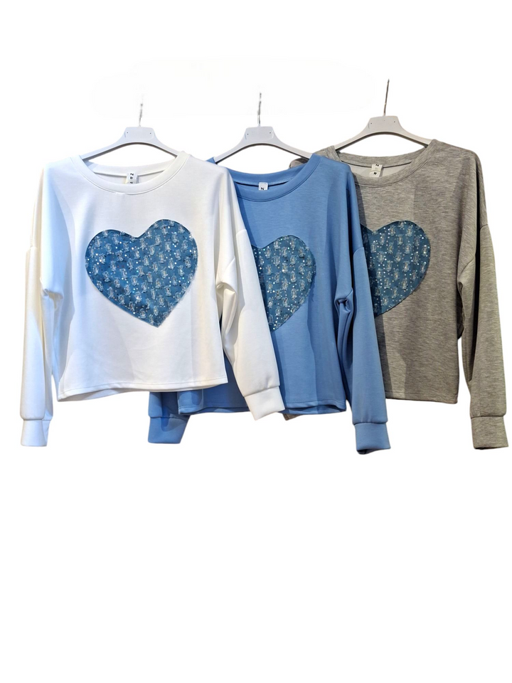 Questa felpa leggera girocollo è perfetta per ragazze e donne, con un cuore denim decorato con glitter e paillettes al centro. Aggiungi un tocco di stile unico al tuo look con questa maglia versatile e alla moda. Confortevole e facile da indossare, è l'ideale per ogni occasione.