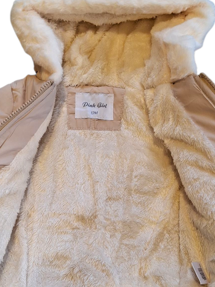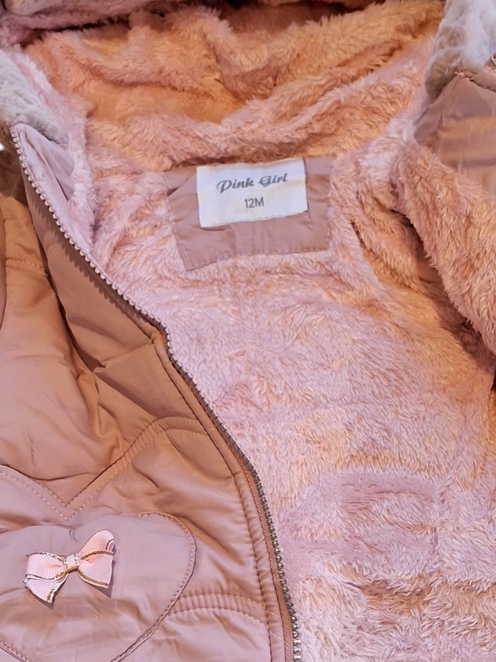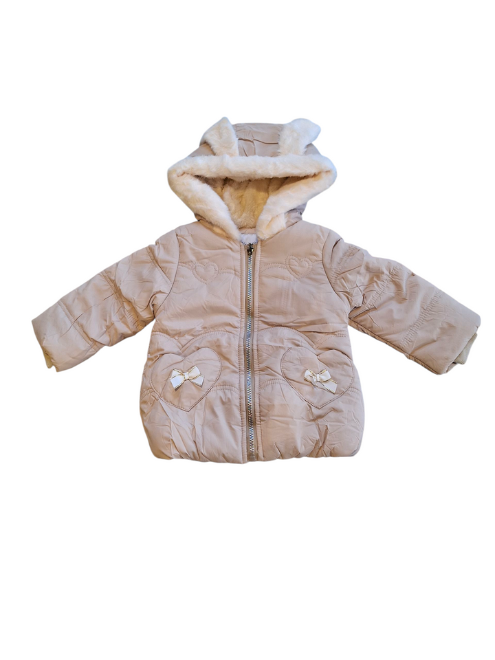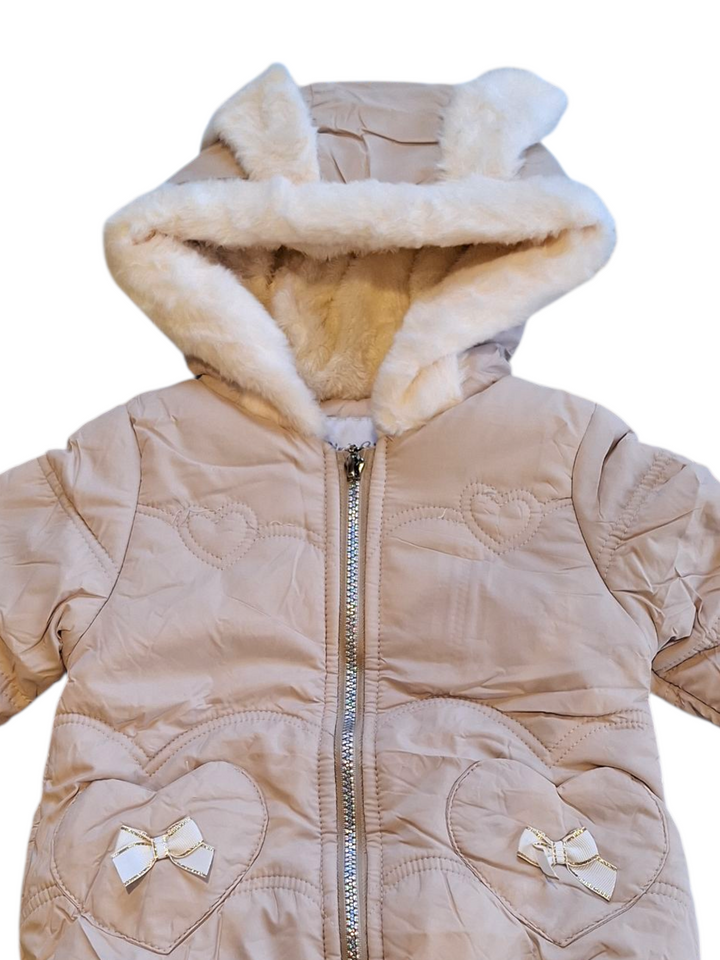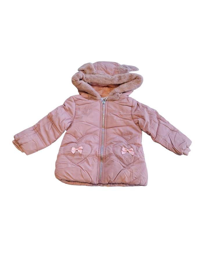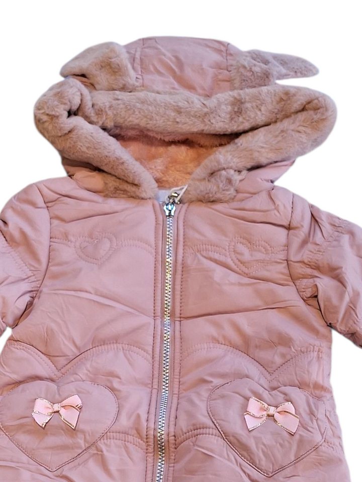 Questo giubbino per femminuccia è perfetto per l'inverno, grazie al cappuccio con pelliccetta e orecchie a forma di coniglietto. Le tasche a cuore lo rendono adorabile e la fodera interna in pelliccetta lo mantiene caldo e confortevole. Ideale per proteggere la tua bimba dal freddo con stile.