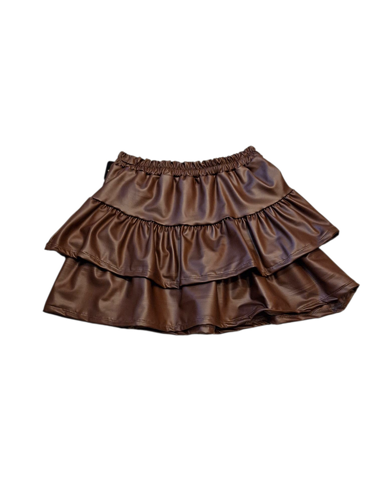 Questa gonna di pelle a balze è il perfetto mix di stile e comfort. Realizzata in morbida pelle, è caratterizzata da balze che donano un tocco di eleganza e movimento ad ogni passo. Ideale per una serata fuori o per un look casual chic, si adatta a ogni occasione.