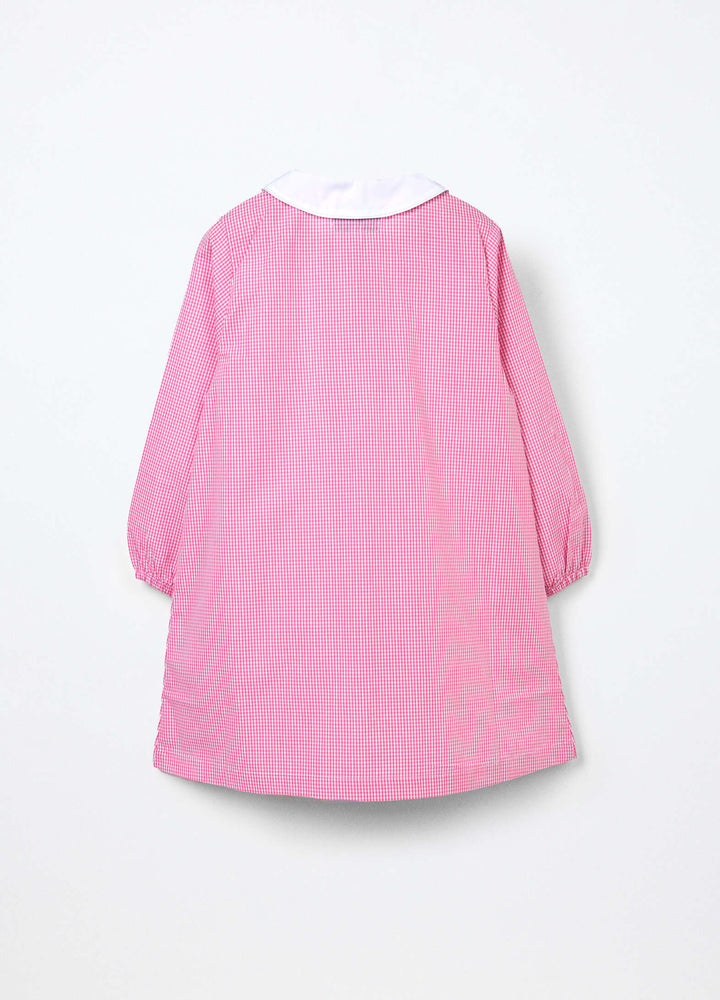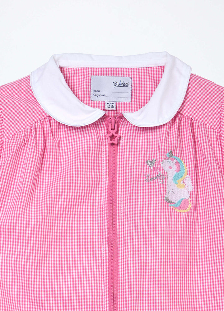 Grembiule misto cotone con motivo a quadri e ricamo. Chiusura full zip. Colletto Peter Pan a contrasto. Due tasche applicate sul davanti. Polsini con arriccio.