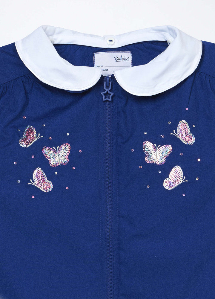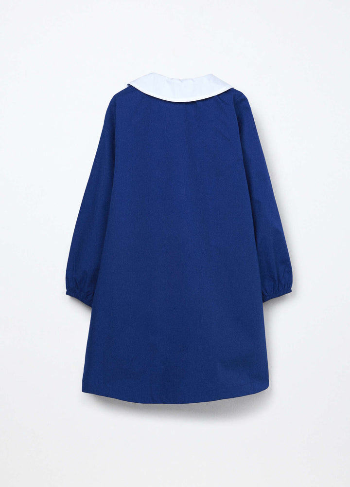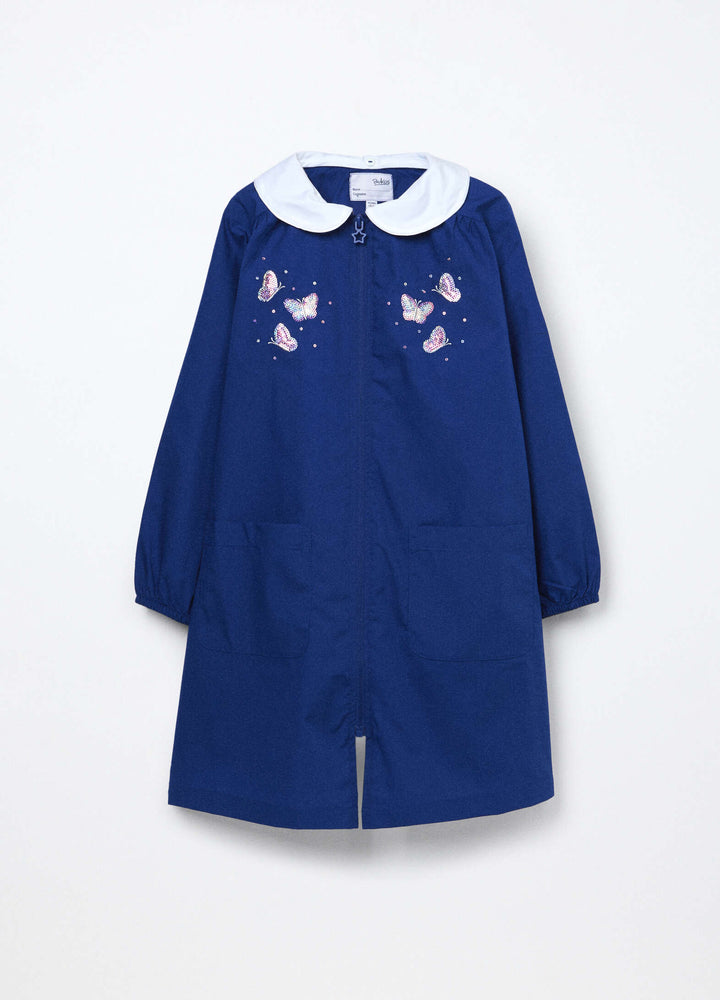 - Grembiule misto cotone con colletto Peter Pan a contrasto. Chiusura a zip i e due tasche applicate sul davanti. Maniche lunghe con polsini elasticizzati. Paillettes applicate.