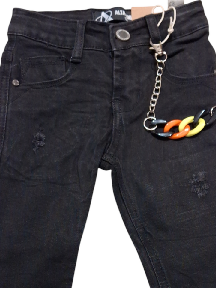 Questi jeans neri sono perfetti per bambini grazie alla vita regolabile che si adatta a qualsiasi taglia. Inoltre, sono dotati di una pratica catenella removibile. I dettagli di piccoli finti strappi aggiungono un tocco di stile all'outfit. Preparati a un look alla moda e comodo allo stesso tempo.