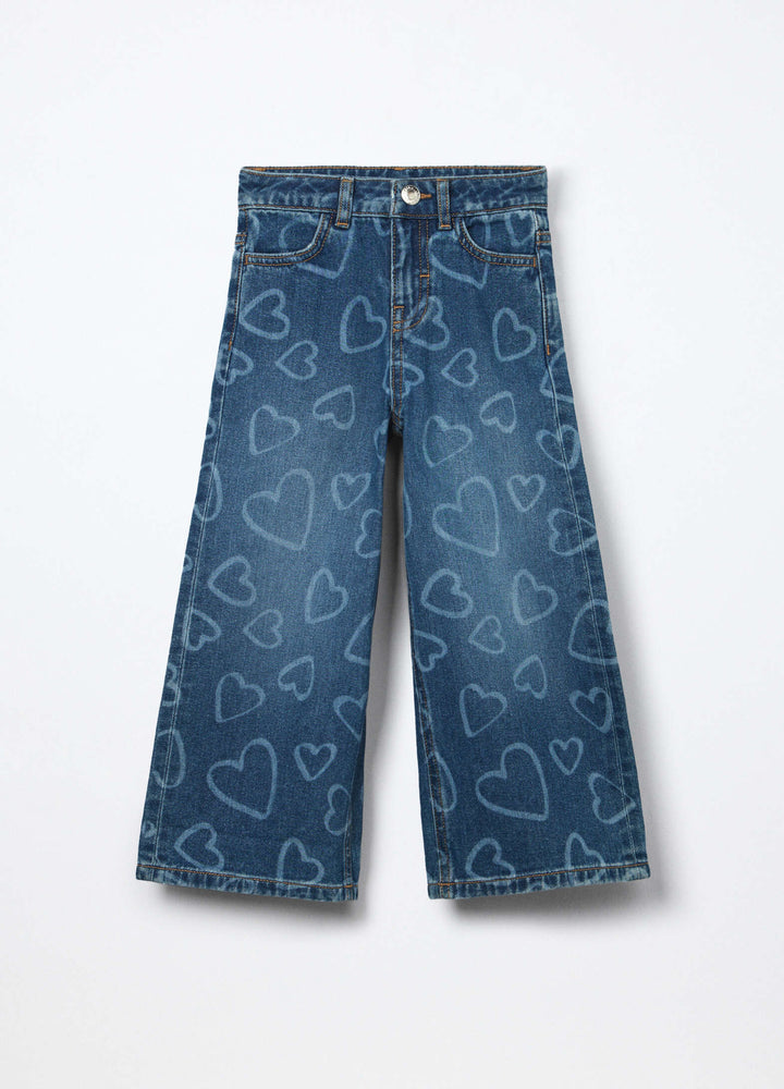 - Pantaloni wide leg in denim di puro cotone con stampa a motivo all over.