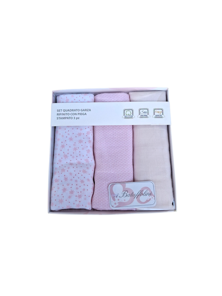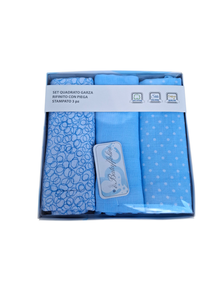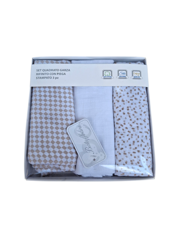 Confezione di 3 quadrati colorati in puro cotone garzato per neonati.