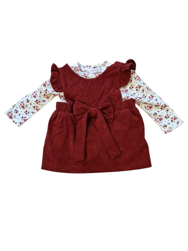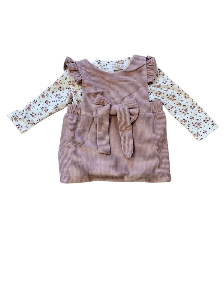 Questa salopette in velluto per femminuccia è perfetta per le giornate più fredde. Il fiocco centrale aggiunge un tocco di grazia e la T-shirt a fiorellini rende il look ancora più dolce. I bottoncini sulla spalla facilitano il cambio di vestiti. Moda e funzionalità in un unico capo.