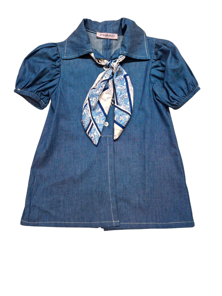 Questo completo per femminuccia è l'outfit perfetto per l'estate! La camicia color denim ha una mezza manica a palloncino, mentre il foulard removibile aggiunge un tocco di stile. I pantaloncini, con il loro finto bottone, sono sia comodi che alla moda. Preparati a farla sentire una principessa con questo completo!