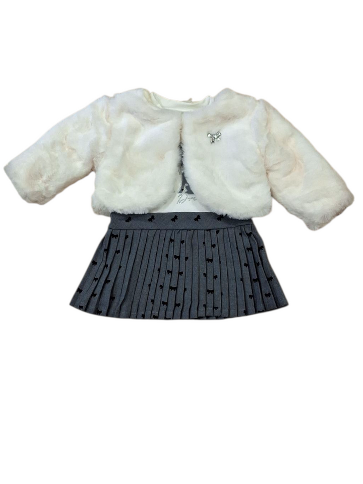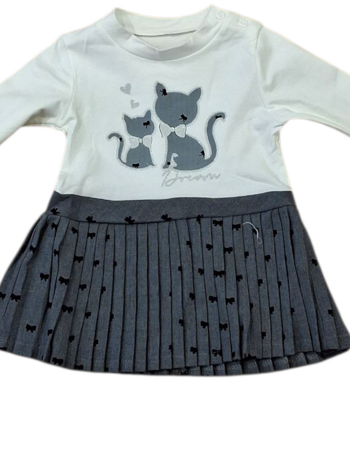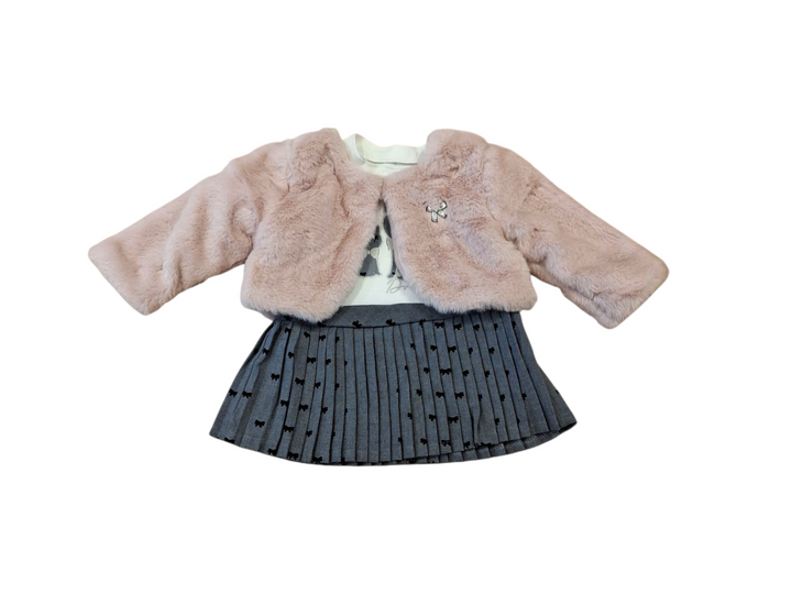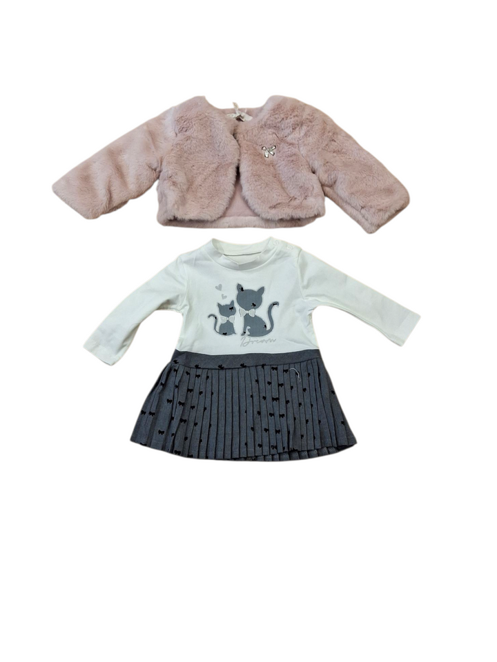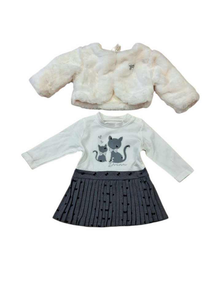 Il set per bambine è composto da una morbida pelliccetta corta e un grazioso abito con stampa di adorabili gattini al centro. La gonnellina plissettata con fiocchetti completa il look. Perfetto per un look dolce e confortevole che farà felice ogni bambina.