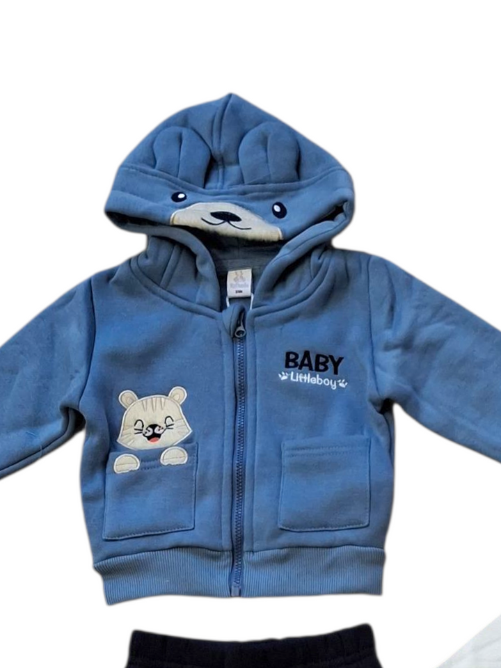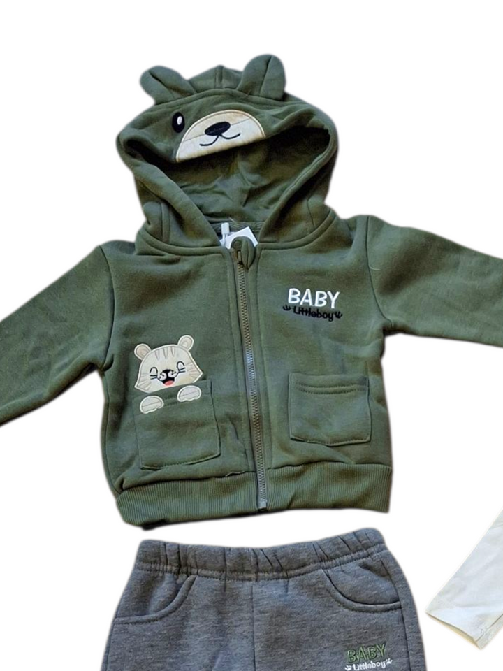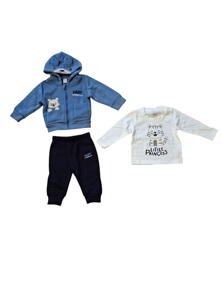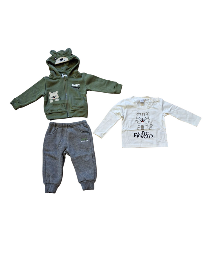 Senza fatica e con stile! La Tuta 3 pezzi per maschietto comprende una felpa con simpatiche orecchie, una T-shirt con stampa e un pantalone. Vesti il tuo bambino con comodità e allegria grazie a questi capi di vestiario unici.