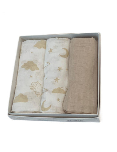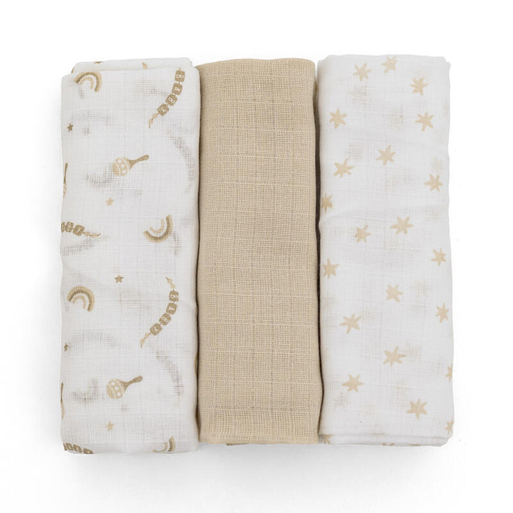 Confezione di 3 quadrati colorati in puro cotone garzato per neonati.