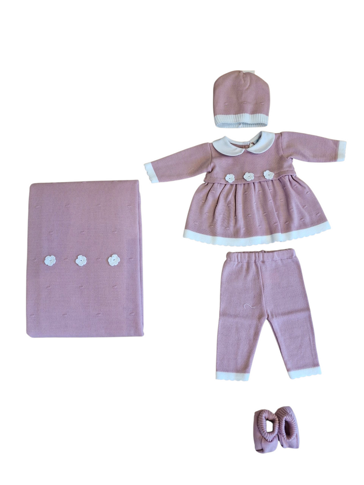 L'elegante set di uscita clinica per femminuccia include copertina, tutina, cappellino e scarpine. Realizzato in morbido tessuto in lana e acrilico al 50%, garantirà il massimo comfort e calore alla tua bambina. Perfetto per l'uso in ospedale o per accogliere la tua piccola nella sua nuova casa.