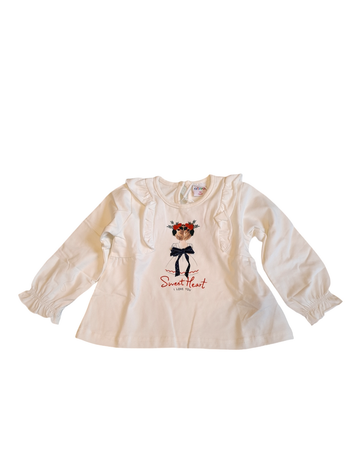 T-shirt manica lunga felpata con bambolina con fiocco,riccioletti alle spalle e ai polsi. Comodissima sia da sola che come completamento di un abitino