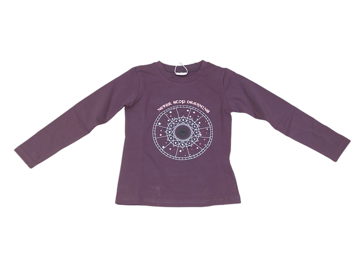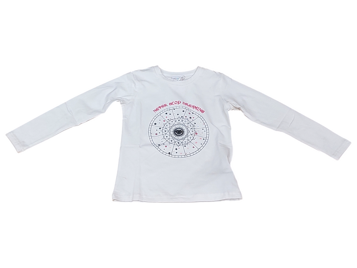 Questa T-shirt "NEVER STOP DREAMING" è perfetta per le ragazze con il suo girocollo e maniche lunghe che la rendono adatta per le giornate più fresche. Realizzata in caldo cotone, con una stampa al centro che ti ricorda di non smettere mai di sognare.