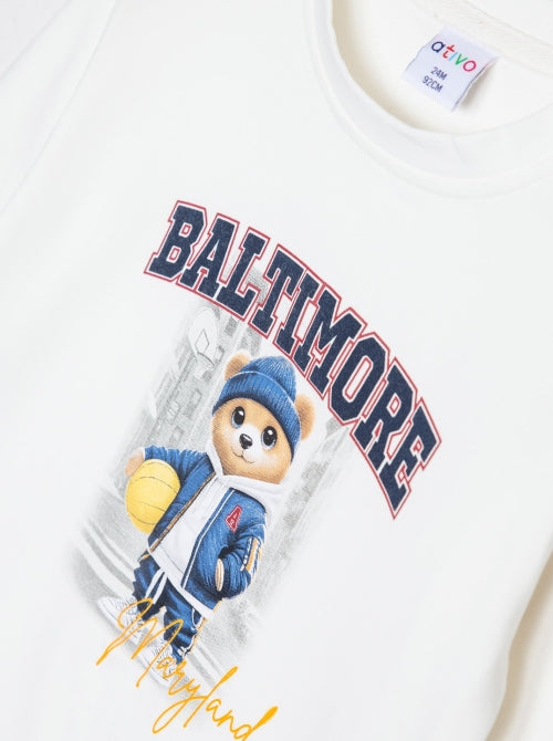 Questa T-shirt manica lunga in cotone è perfetta per il tuo maschietto. Il design carino con stampa orsacchiotto lo terrà caldo e alla moda. Realizzata con cotone di alta qualità, questa maglietta è morbida e confortevole sulla pelle sensibile del tuo bambino.