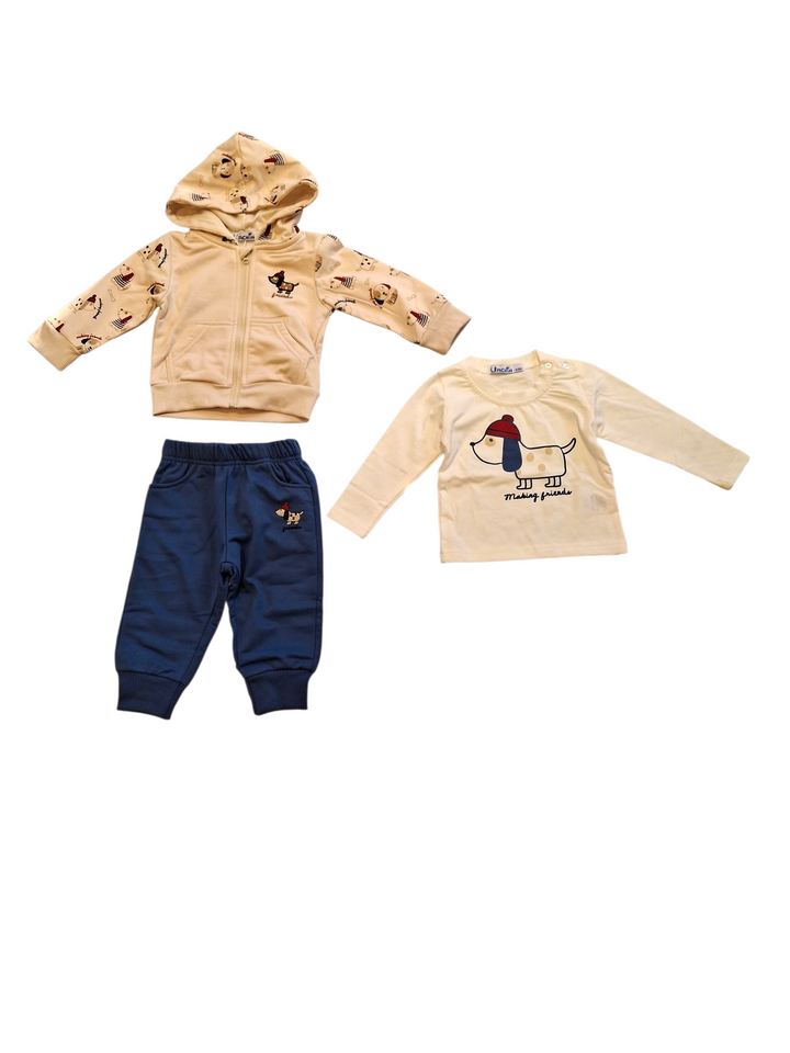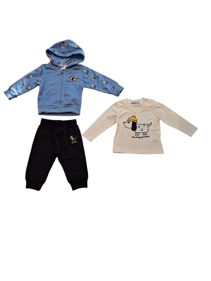Questo set 3 pezzi per maschietti è perfetto per un look casual e confortevole. Include una felpa con zip e cappuccio, una t-shirt manica lunga e un pantalone tuta. Realizzato con materiali di qualità, garantisce un'abbondante libertà di movimento e un calore duraturo. Ideale per ogni attività all'aria aperta.