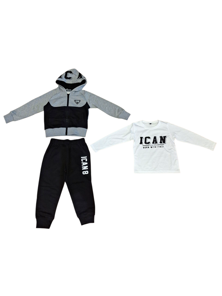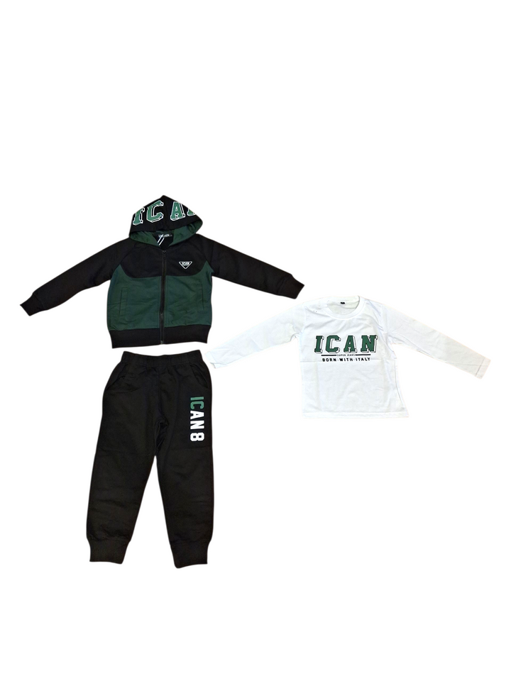 Completa il guardaroba del tuo piccolo con questa tuta 3 pezzi! Include una comoda felpa con cappuccio e cerniera, una t-shirt a manica lunga con stampa e un pantalone con polsini. Stile e praticità sono garantiti per il tuo maschietto!