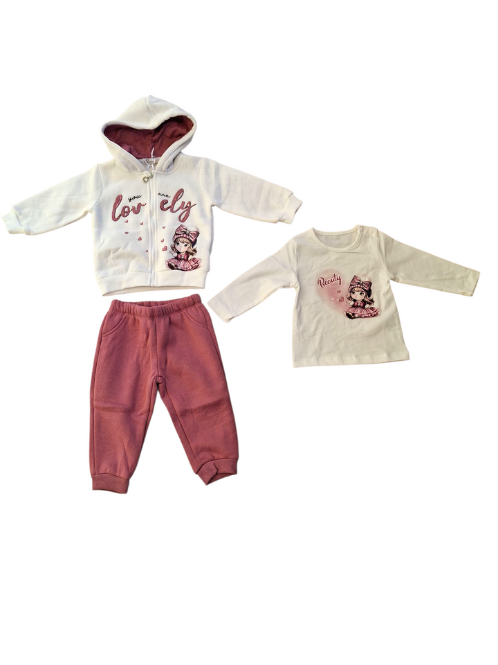Questo completo tuta 3 pezzi per femminuccia è perfetto per tenere la tua bambina comoda e alla moda. Include una felpa con cappuccio,chiusura zip e una stampa bambolina rqffigurata anche sulla T-shirt manica lunga abbinata. Il pantalone comodo garantisce una vestibilità perfetta.